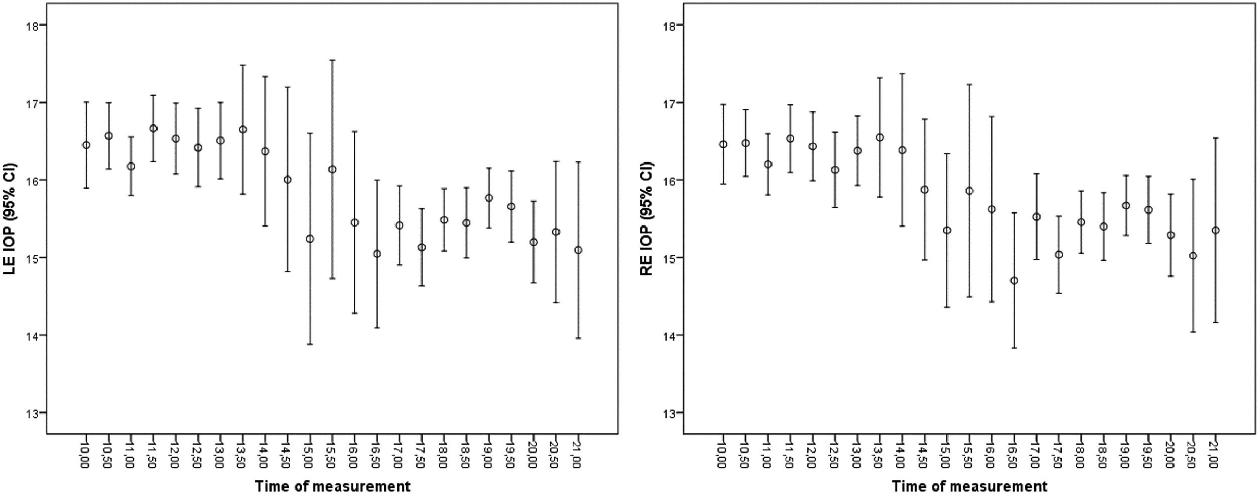 Data were analysed according to country of origin, revealing 257 Portuguese data points and 2955 Spanish data points (Table 4 of the supplementary material), with no statistically significant differences in the IOP for both eyes (p > 0.09). Furthermore, the data were organised according to the time of day at which they were collected, with the aim of identifying variations throughout the day that are compatible with the circadian rhythm of IOP. Fig. 1 shows the right and left eye IOP data according to the time of day at which they were collected. In Fig. 2, the mean and 95 % confidence interval were calculated for the same data as a function of the time at which they were taken. The IOP peaks between 10 a.m. and 12 a.m. and decreases from 6 pm. onwards, with a tendency to decrease further at the end of the day.