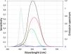 S-Cone (blue line), M-Cone (green line) and l-Cone (red line) sensitivity for each wavelength (Left Y-axis) and its sum (black line).37 Normalized emission spectrum for blue OLED screens (dotted light blue) (Right Y-axis). Dotted dark line represents the multiplication of the dotted light blue line and the black line (V-lambda), which has a maximum at 460 nm.
